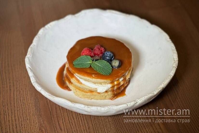 Ніжні панкейки з крем-сиром, лохиною, полуницею та карамеллю.