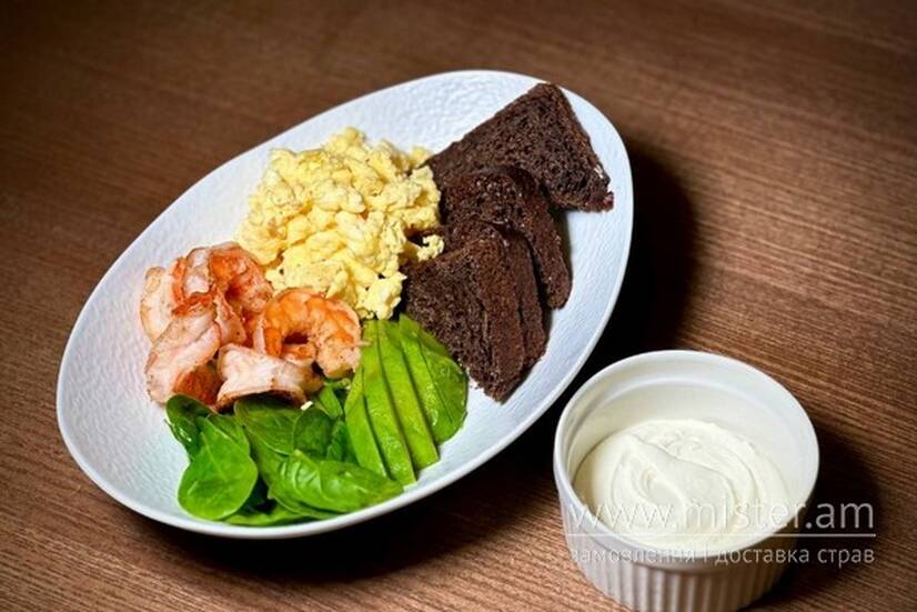 Скрембл, авокадо, креветка, крем-сир, олія оливкова, фінський хліб, шпинат.