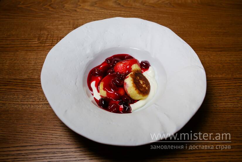 Сирники з кисломолочного сиру з грецьким йогуртом та вишневим компоте.
