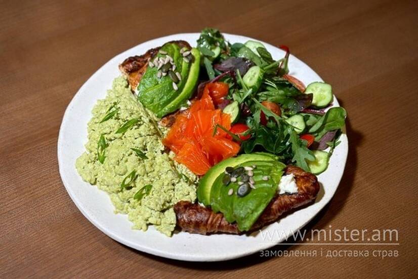 Ніжний вершково-шпинатний скрембл з фореллю, авокадо, міксом салату, чері та страчателлою.