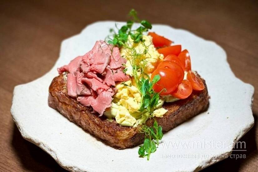 Бріош, вершкове масло, ростбіф, скрембл, крем з авокадо, мікрогрін, чері, цибулевий кранч.