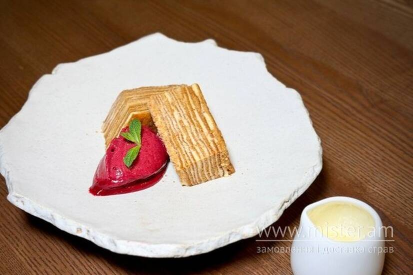 Вишневий сорбет, медові коржі, крем на основі сметани.
