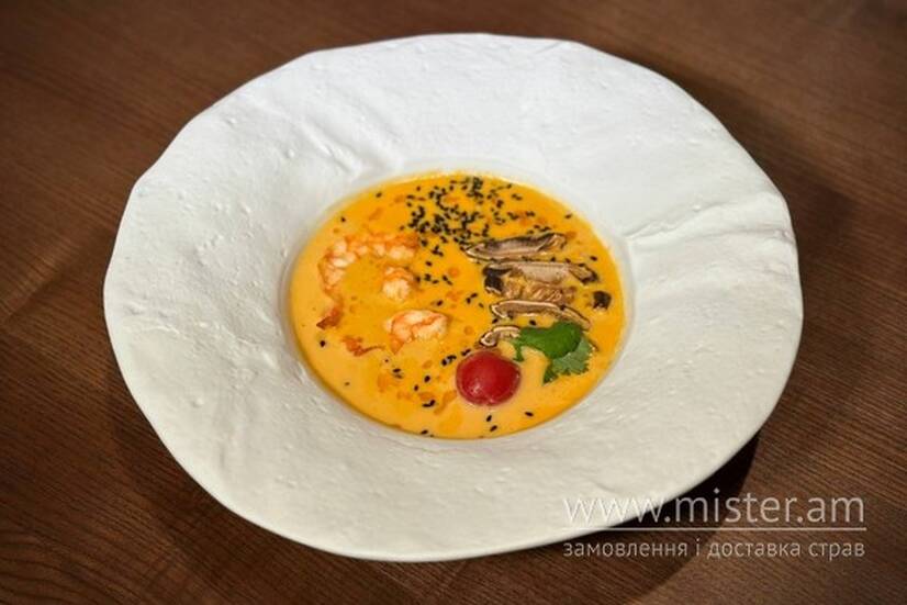 Том Ям на основі рибного бульйону, пасти Том Ям, кокосових вершків з грибами Шиїтаке, креветкою, чері.