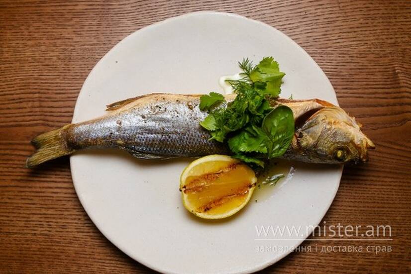 Сібас, оливки, соус чімічурі, мікс зелені, маслини.