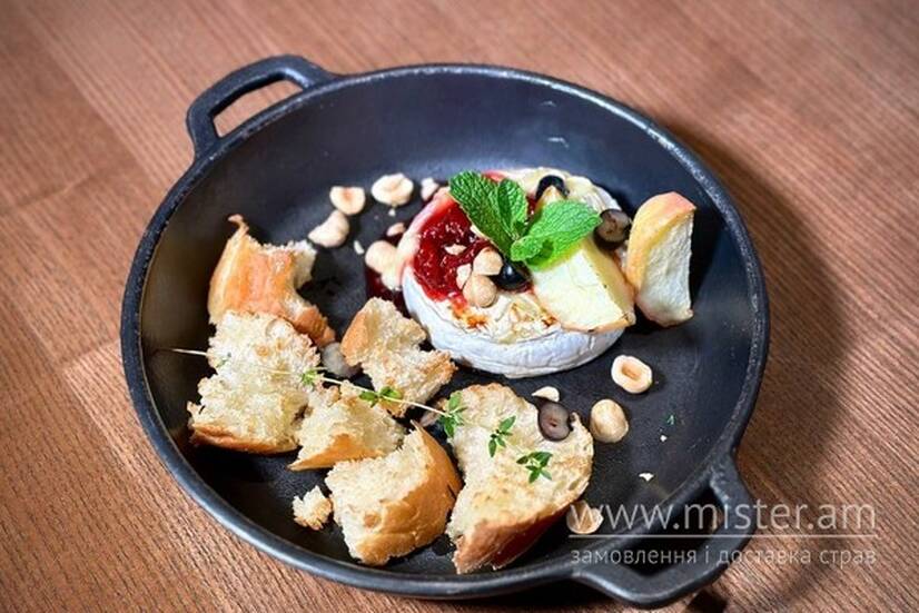 Сир камамбер, яблуко, лохина, горіх фундук, вишневе компоте, багет, оливкова олія.
