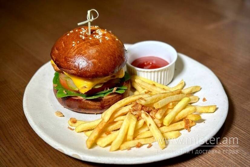 Булочка бріош, курча, цибулевий кранч, маринований огірок, томат, медово-гірчична заправка.