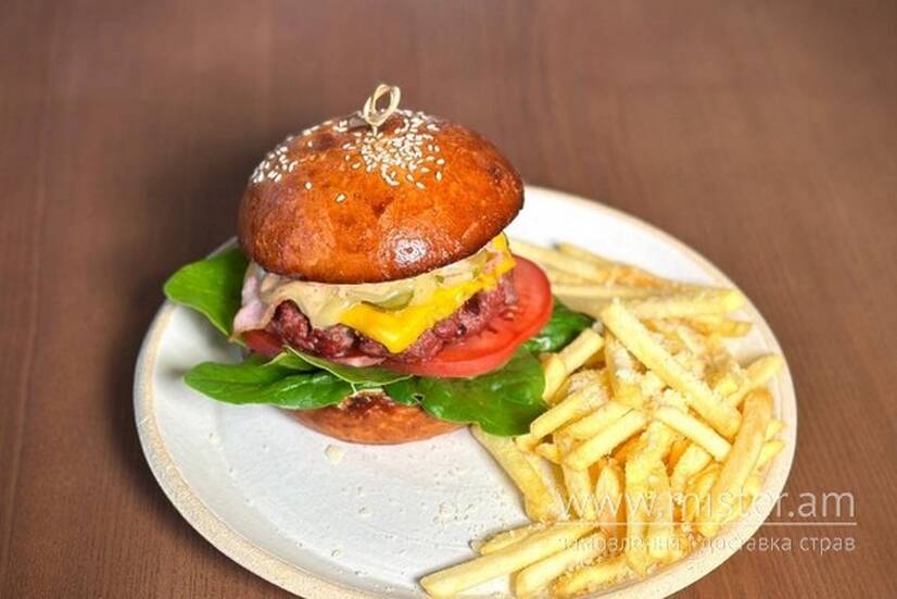 Бургер з котлетою з мармурової яловичини, сиром Чеддер, маринованими огірками, роменом, беконом, томатами та цибулею конфі. Заправляється соусом спайсі та медово-гірчичною заправкою. Подається разом з хрусткою картоплею фрі.