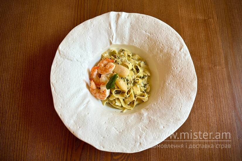 Паста з креветками, гребінцями та сиром Пармезан у вершковому соусі.