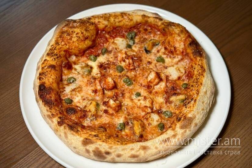 Тісто на заквасці, соус на основі томатів пелаті та оливкової олії, сир моцарела, сир Пармезан, мідії, креветки, гребінці, каперси.