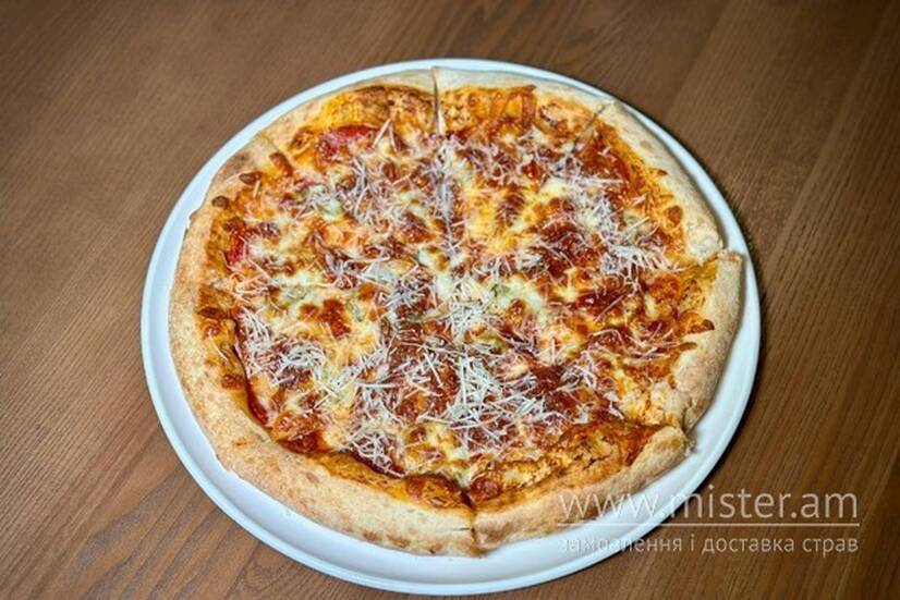 Тісто на заквасці, пепероні, огірок маринований, соус томатний на основі пелаті, сир моцарела, сир Пармезан.