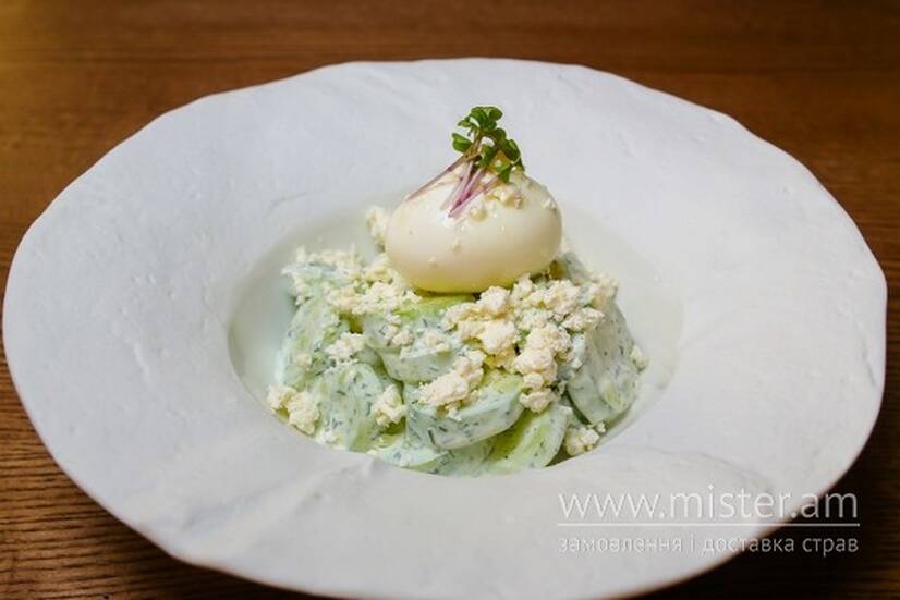 Яйце пашот, огірок, дзадзики, сметана, бринза, йогурт.