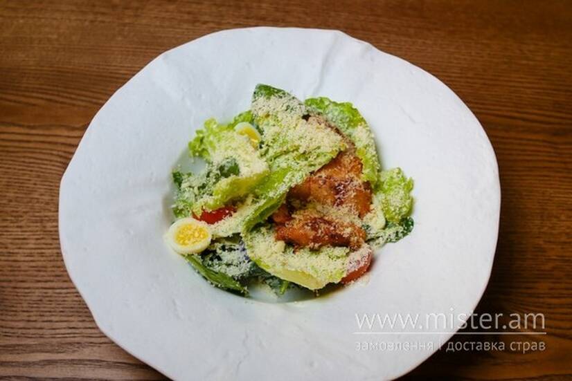 Ромен, соус Цезар, черрі, яйця перепелині, Пармезан, стегно курки, олія рослинна, паприка.