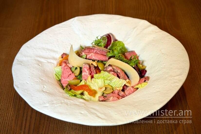 Ростбіф, запечений болгарський перець, мікс салату, салат ромен, оливки, горіх фундук, сир Пармезан, соус медово-гірчичний.