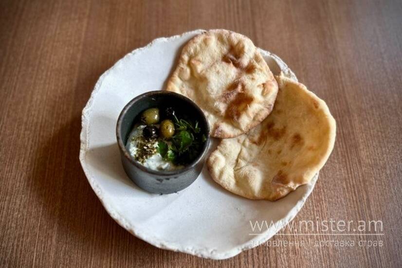 Лабне на основі грецького йогурту, свіжого та маринованого огірка, міксу зелені, оливкового масла, оливок.