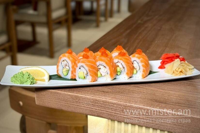 Рис, норі, японський майонез, вугор, ікра лососева, авокадо, лосось.