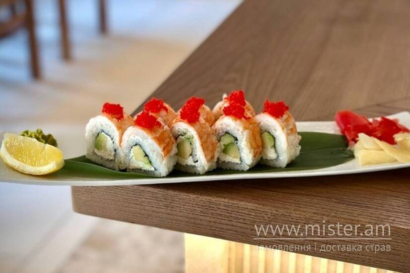 Рис, норі, крем-сир, авокадо, креветка, унагі, ікра тобіко.