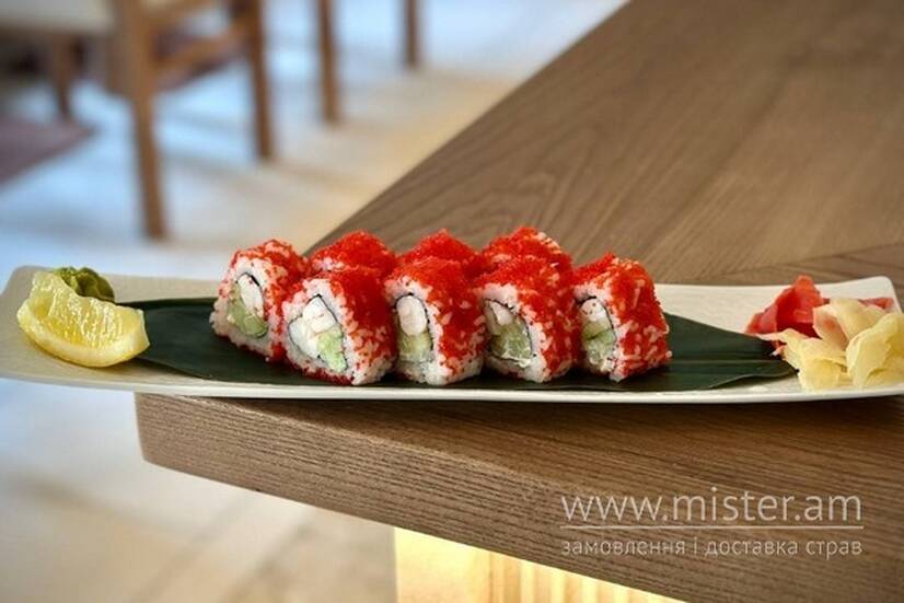 Рис, норі, креветка, японський майонез, ікра тобіко, огірок.