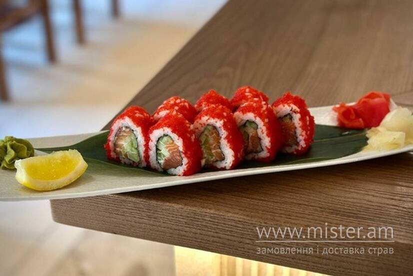 Рис, норі, лосось, японський майонез, ікра тобіко, огірок.