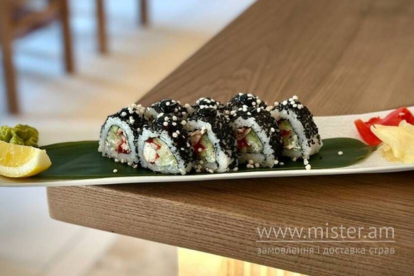 Рис, норі, вугор, японський майонез, ікра тобіко, огірок, кунжут чорний.
