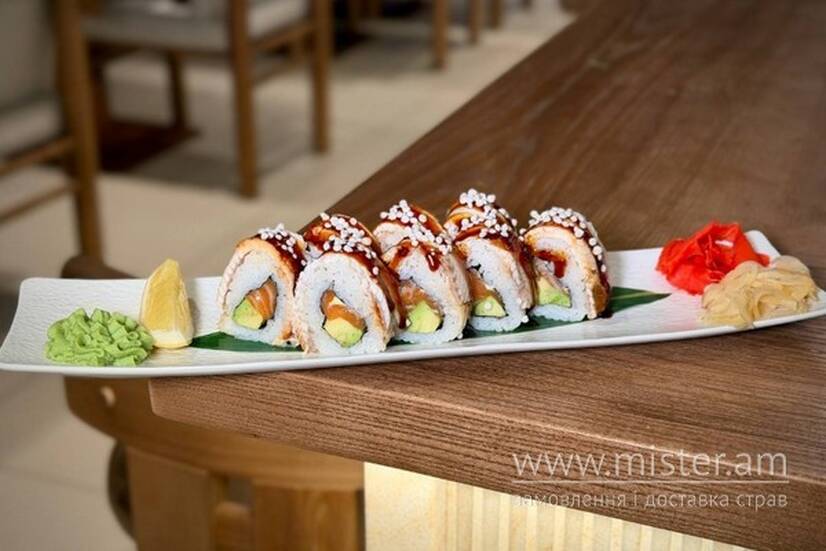 Норі, рис, авокадо, японський майонез, вугор, лосось, унагі.