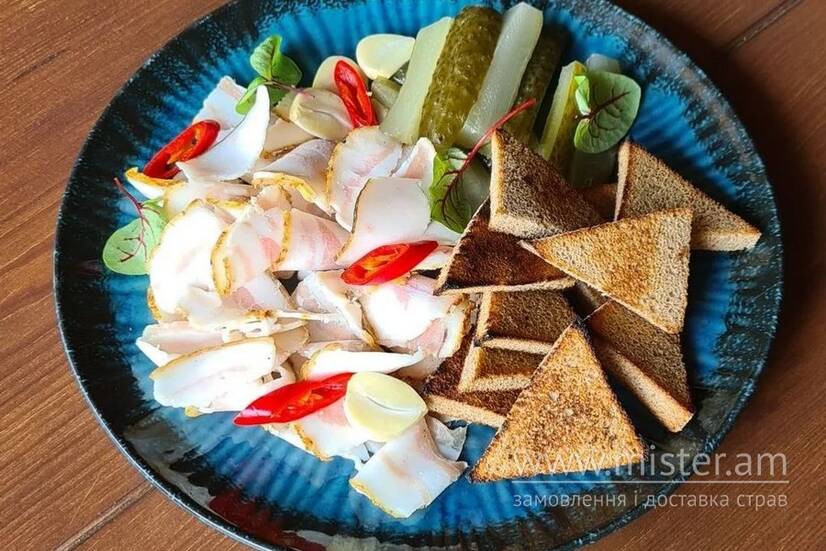 Сало, часник, огірок солоний, гріночки, перець чілі.