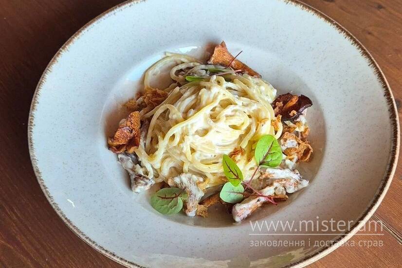 Макарони твердих сортів, лисички, цибуля, часник, пармезан, вершки.