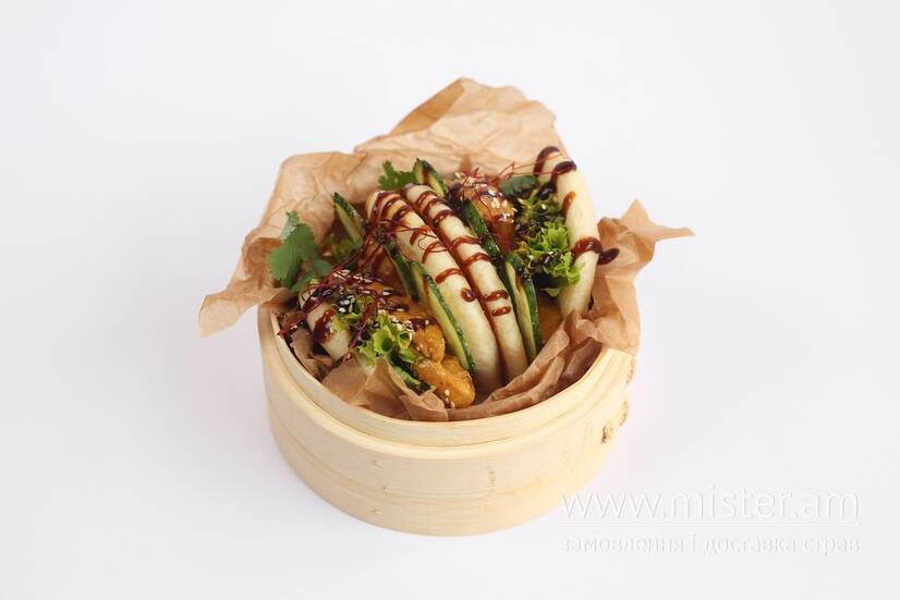 Парова булочка бао, курка, соус спайсі масала, салат айсберг, огірок, кінза, кунжут, соус унагі.