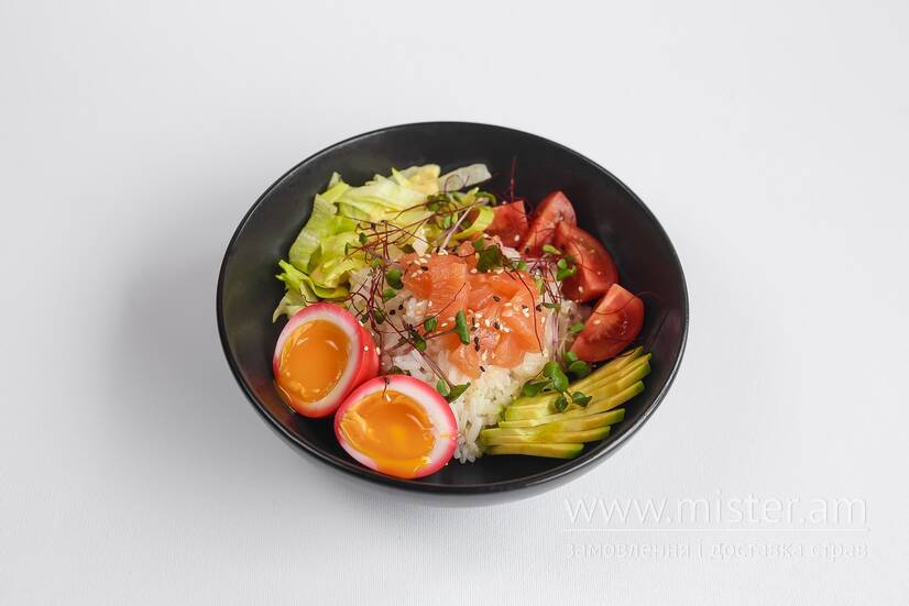 Рис, салат айсберг, соус цезар, мариноване яйце, томат, лосось, авокадо, соус унагі, кунжут.