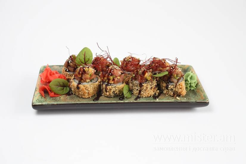 Норі, рис, крем-сир Філадельфія, огірок, тунець, авокадо, соус тайський, соус унагі, темпура, сухарі панко, кунжут.