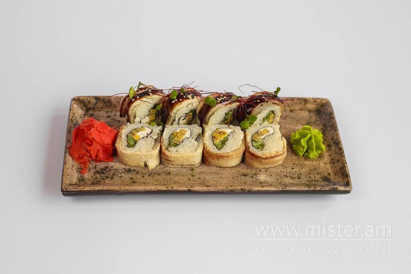 Норі, рис, вугор, крем-сир Філадельфія, огірок, омлет, соус унагі, кунжут.