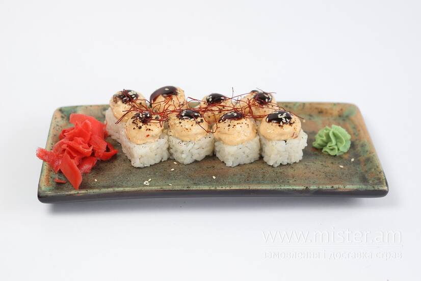 Норі, рис, крем-сир Філадельфія, омлет, моцарелла, вугор, соус унагі, кунжут. 8 шт.