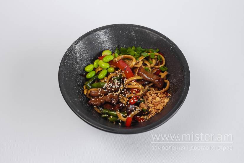 Локшина, телятина, болгарський перець, спаржева квасоля, соус удон, кунжутна олія, імбирно-часникова паста, кунжут, зелена цибуля, боби едамаме, арахіс, цибуля фрай.