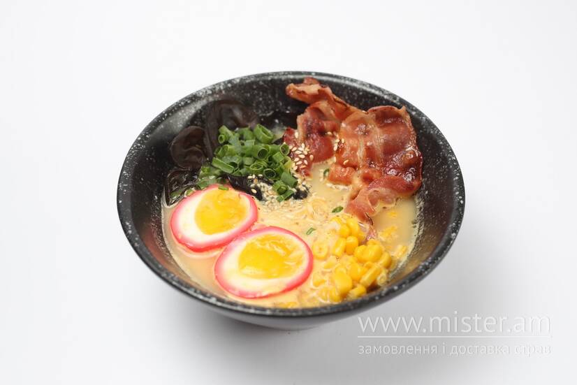 Бульйон сирний рамен, локшина, бекон, гриби фунгус, норі, кукурудза, мариноване яйце, кунжутна олія, кунжут, зелена цибуля.
