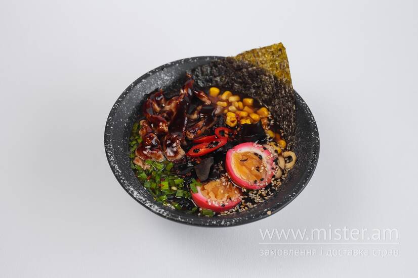 Бульйон шою рамен, локшина, курка діп фрай, гриби фунгус, норі, кукурудза, мариноване яйце, кунжутна олія, кунжут, зелена цибуля, соус теріякі, копчені пластівці чилі та свіжий чилі кілечками.