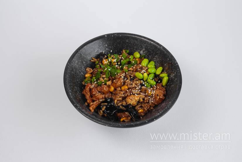 Рис просмажений з куркою, скремблом, кукурудзою, соусом wok, імбирно-часниковою пастою, грибами фунгус, кунжутною олією, кунжутом, зеленою цибулею та бобами едамаме.