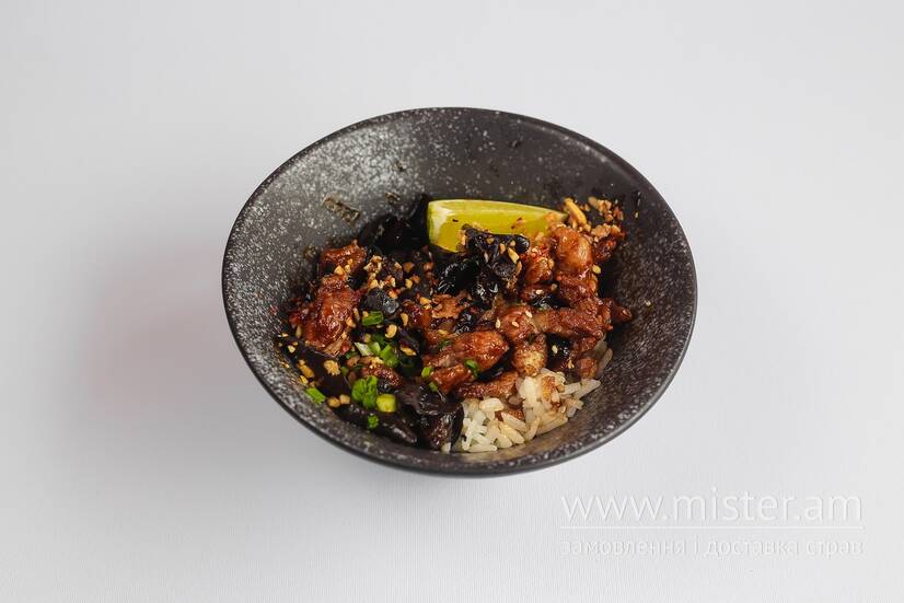 Рис, курка діп фрай, соус wok, гриби фунгус, імбирно-часникова паста, кунжутна олія, кунжут, кінза, лайм, боби едамаме, арахіс, цибуля фрай, копчені пластівці чилі та свіжий чилі кілечками.