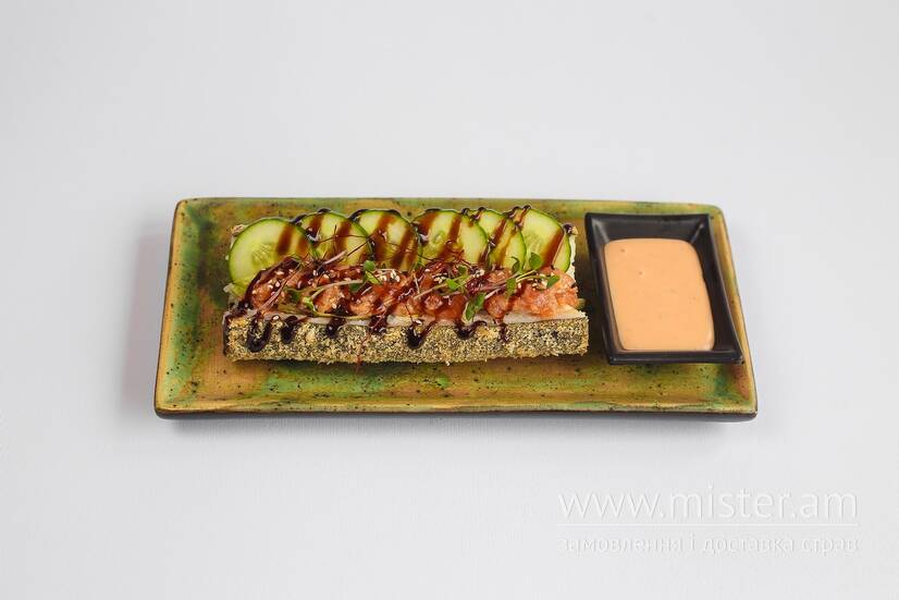 Норі, рис, тартар з лосося, огірок, салат айсберг, крем-сир Філадельфія, темпура, сухарі панко, соус унагі, зелена цибуля, кунжут.