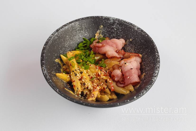 Ток покі, бекон, болгарський перець, сирний соус, кунжутна олія, кунжут, зелена цибуля, копчені пластівці чилі.