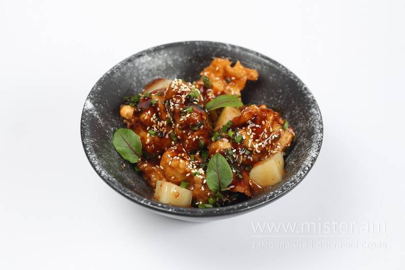 Курка, кляр, кисло-солодкий соус, ананас, імбирно-часникова паста, кунжут, зелена цибуля, соус теріякі.