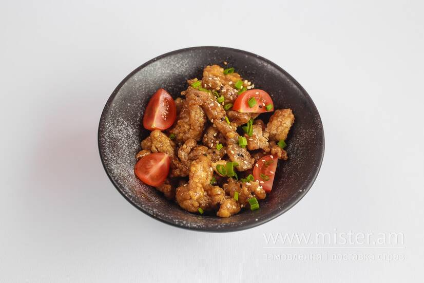 Курка, кляр, медовий соус, томат, кунжут, зелена цибуля.