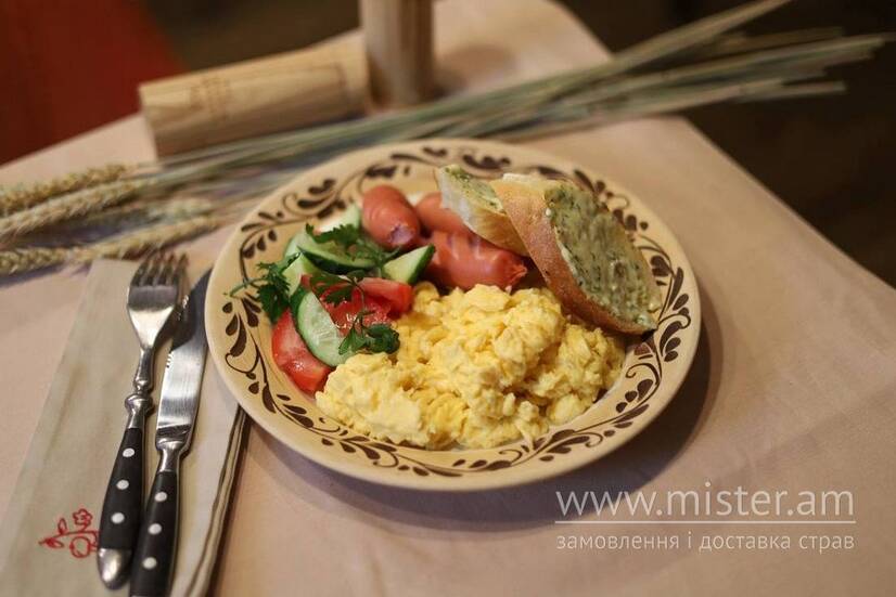 Омлет з трьох яєць зі свіжими овочами, ніжними сосисками, пшеничними грінками з ароматним часниковим маслом.