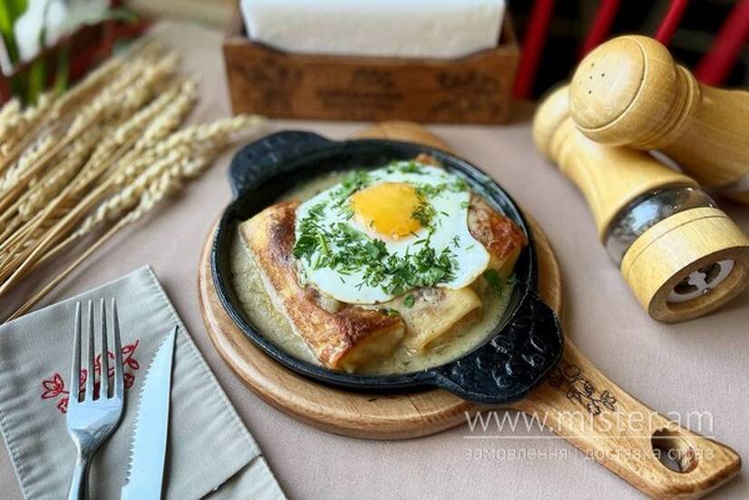 Варенична Балувана Галя Запечені млинці з шинкою, сиром сулугуні та смаженим яйцем