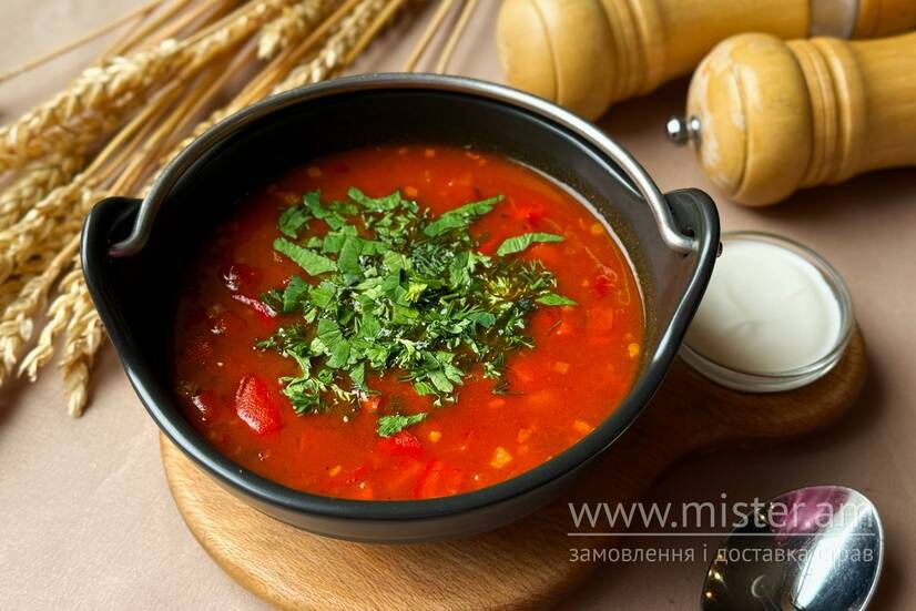 Пікантний та ситний бограч, на яловичому бульйоні, з великою кількістю овочів, томленої свинини, копченого сала, томатів та ароматних спецій, подається зі сметаною та зеленню.