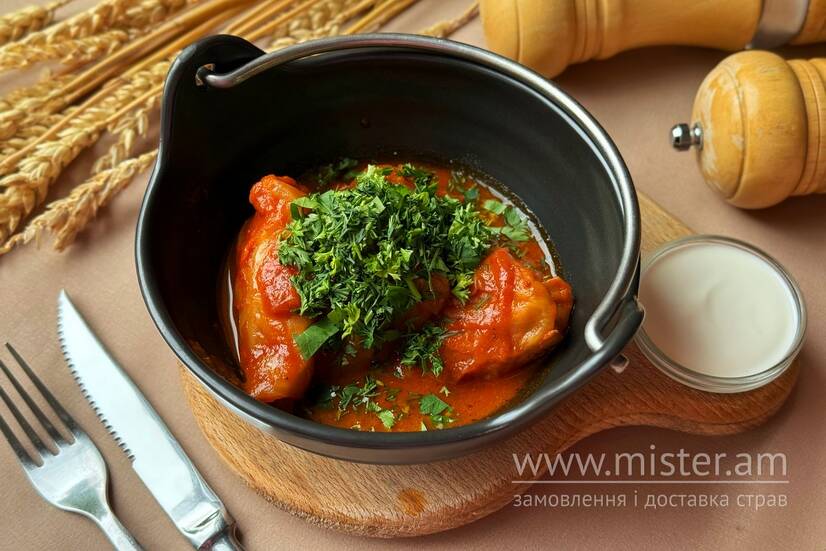 Фарш, відварний рис з цибулею закручені в капусті та тушковані в томатному соусі з цибулею та морквою. Посипається укропом. Подається із сметаною