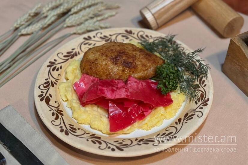 Куряча котлета в хрусткій паніровці з начинкою із свіжої зелені, вершкового масла та дрібно нарізаної шинки. Подається з ніжним картопляним пюре. Смаку та яскравості страві додає маринована капуста "пелюстка".