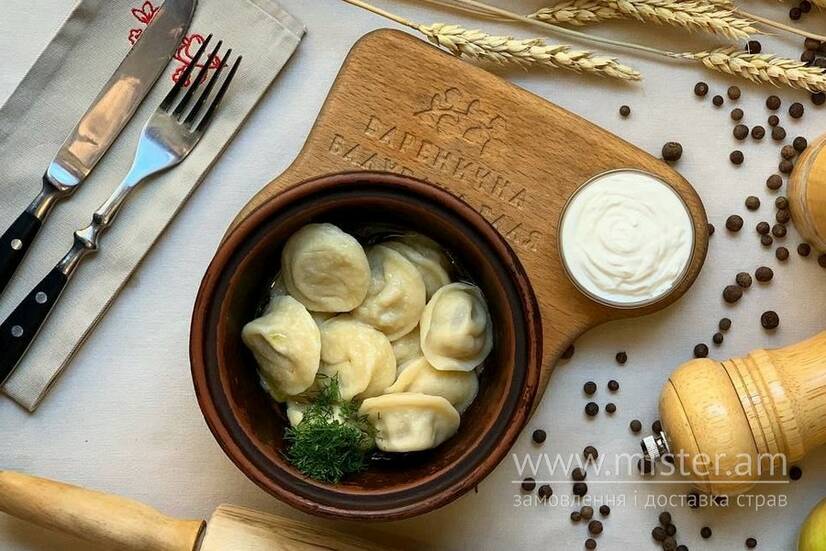 Пельмені зі свинини, поливаються маслом та подаються з бульйоном та сметаною. Посипаються зеленню.