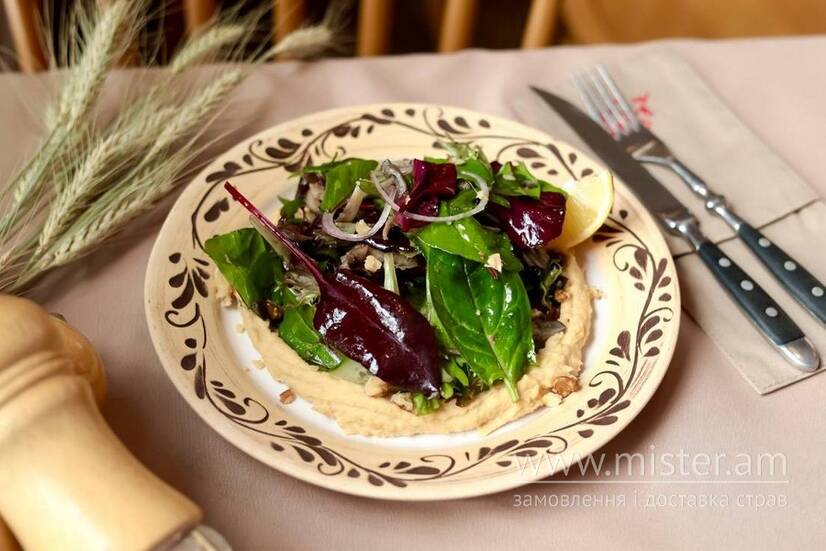 Варенична Балувана Галя Зелений салат з хумусом та гливами