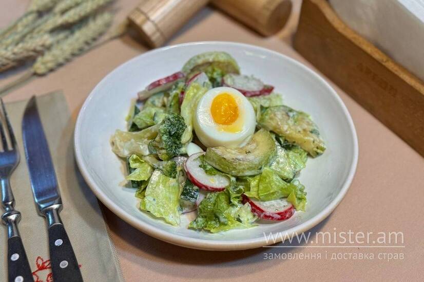 Овочевий салат зі свіжих огірків, редиски, броколі, печеними кабачками, листками зеленого салату та курячим яйцем, заправлений легким сметанковим соусом.