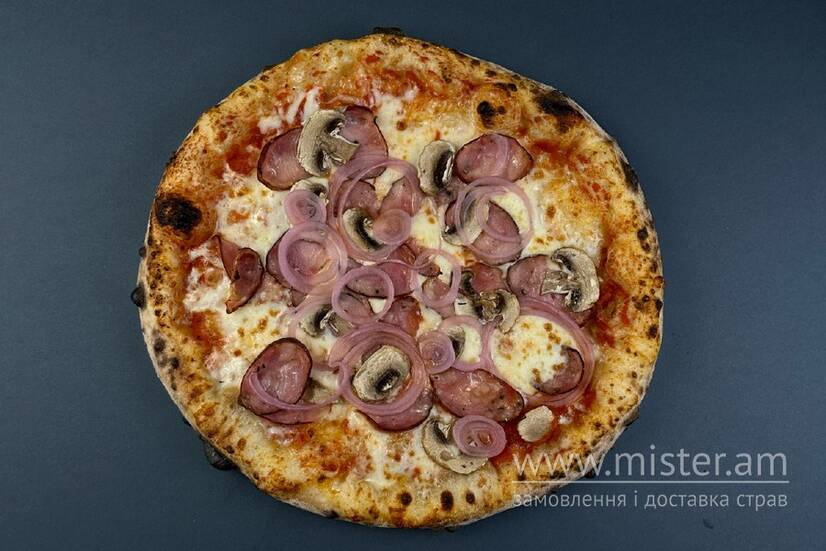 Соус вершково-часниковий, моцарела, домашня ковбаса, маринована цибулька, печериці.
