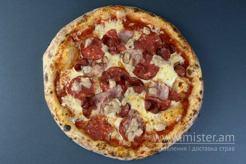 Фірмовий соус пелаті, моцарела, грудинка, салямі, ковбаски, соковите курча.